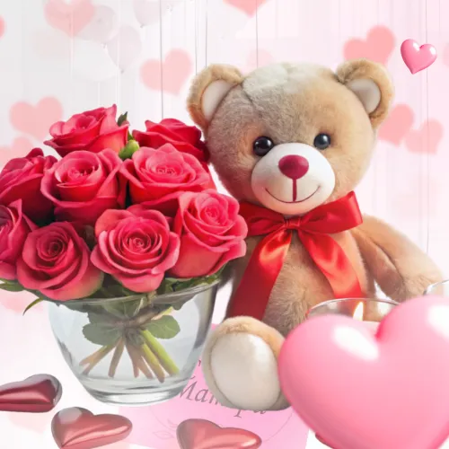 Вариант—Стандарт (9 роз + мягкая игрушка 45 см)