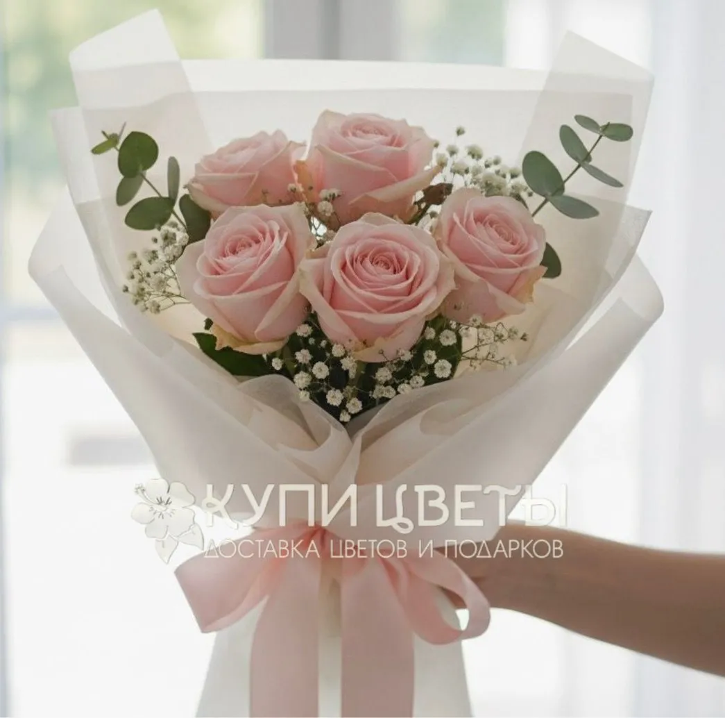 Розовые розы-5 шт., гипсофила, зелень, упаковка, лента