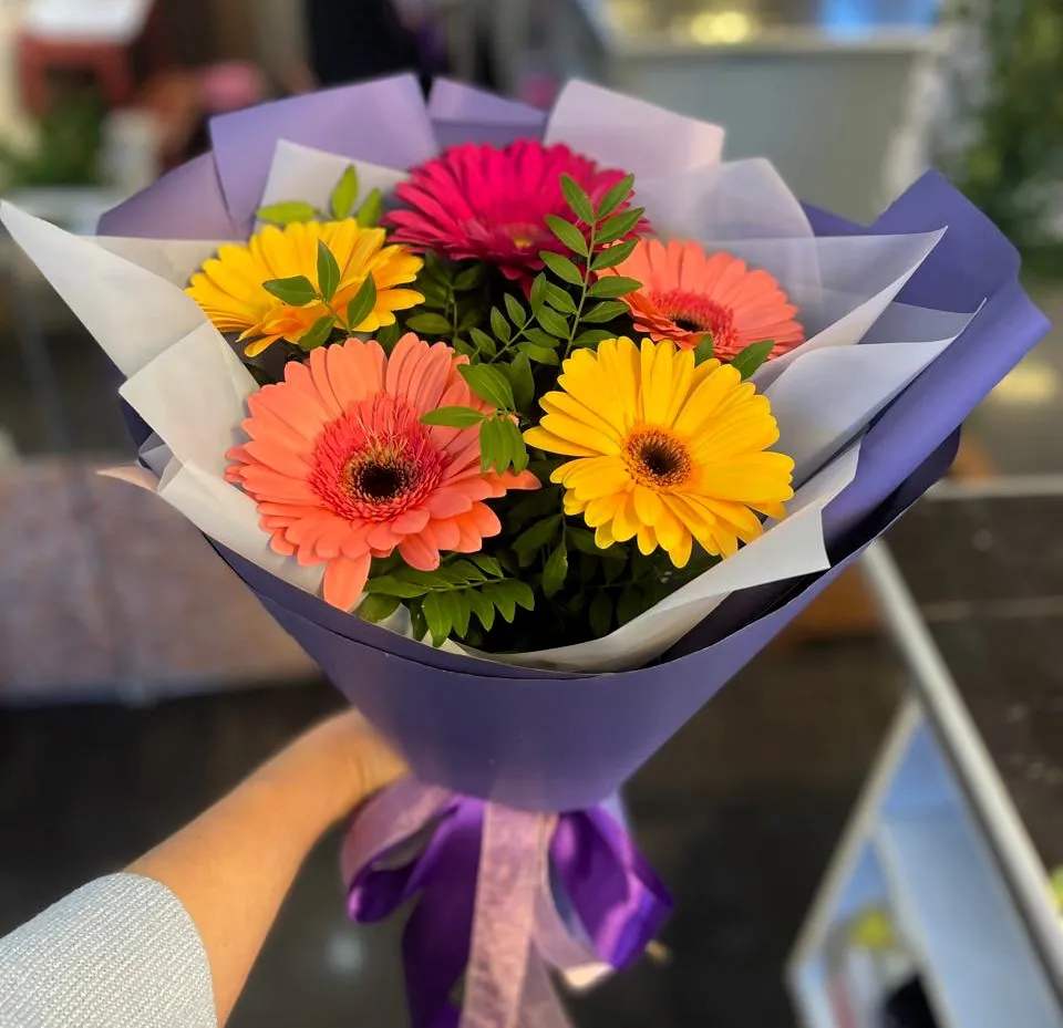 Погрузитесь в калейдоскоп красок с нашим восхитительным букетом из разноцветных гербер! Эти яркие и солнечные цветы несут в себе послание радости и оптимизма. Каждый лепесток, словно мазок кисти художника, играет своим неповторимым оттенком, создавая феерическое зрелище.