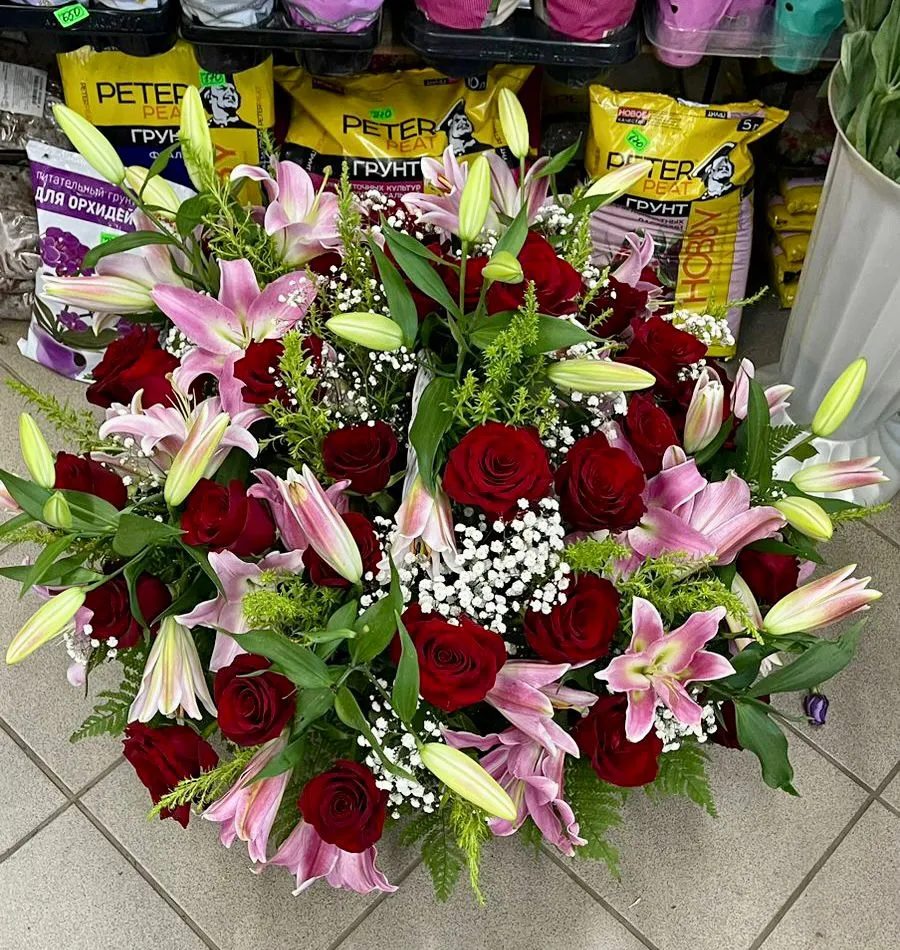 Вариант—Премиум - розы - 31 шт, лилия - 7 шт, гипсофила, корзина, оазис