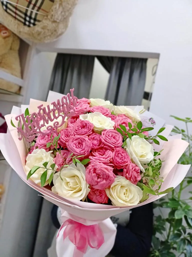 Состав букета: кустовые розы, одноголовые розы ,зелень, упаковка, топпер,лента