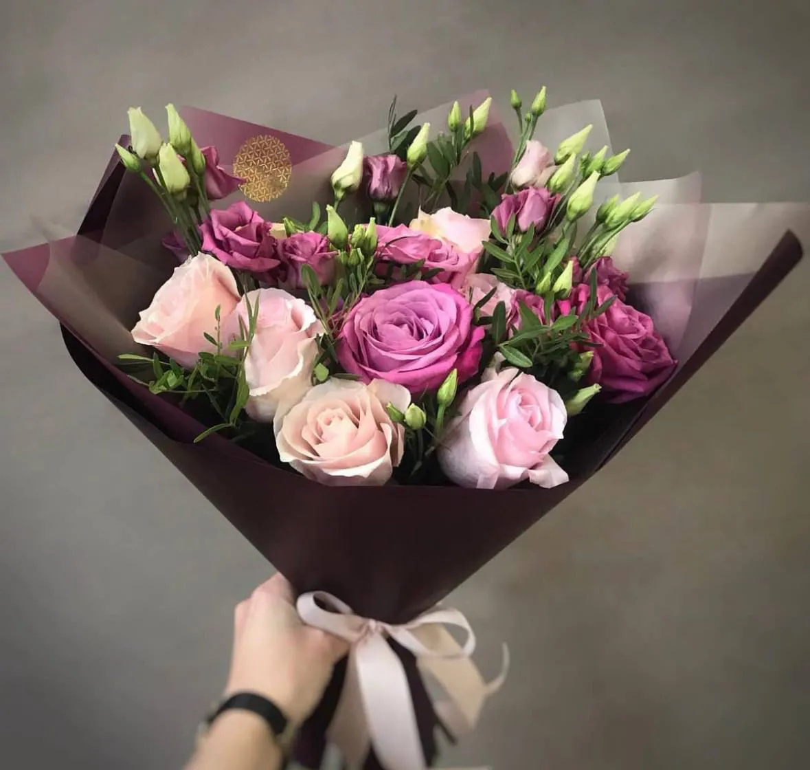 розы, лизиантусы, зелень, упаковка, лента. |