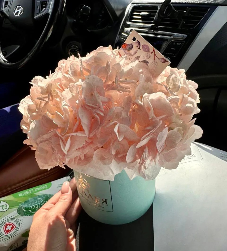 —Букет из розовой гортензии в шляпной коробке