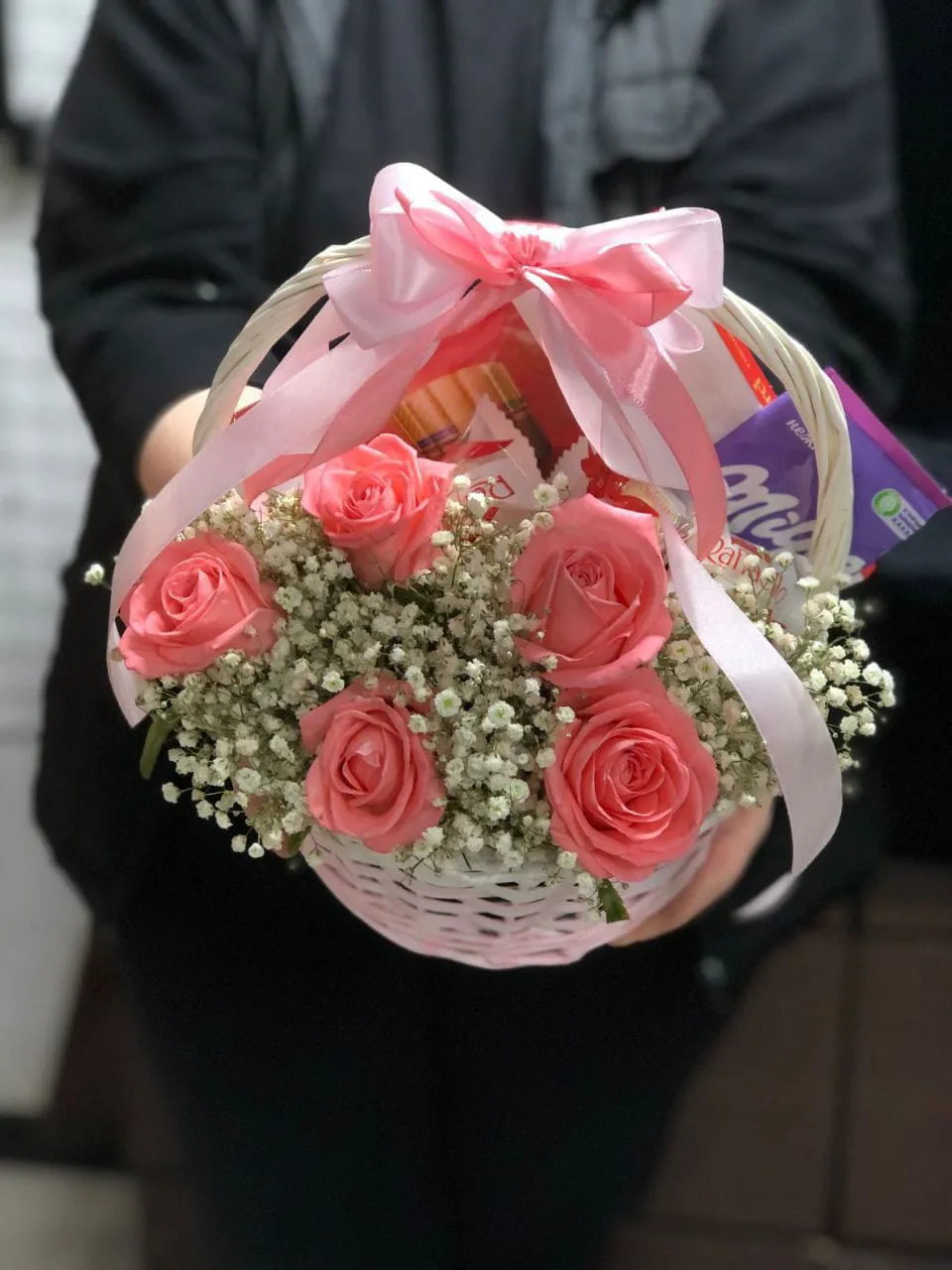 роза - 5 шт., гипсофила - 2 шт., коробка конфет Merci - 1 шт., коробка Raffaello (150 гр.) - 1 шт., шоколадная плитка - 1 шт., корзина, оазис, лента