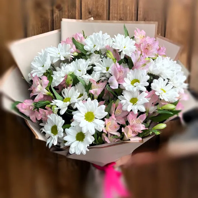 Букет с кустовыми хризантемами и альстромериями – это прекрасный выбор для любого повода. Яркие и долгоцветущие хризантемы поражают своей многообразной палитрой, а альстромерии с их нежными цветами привносят в композицию особую элегантность.