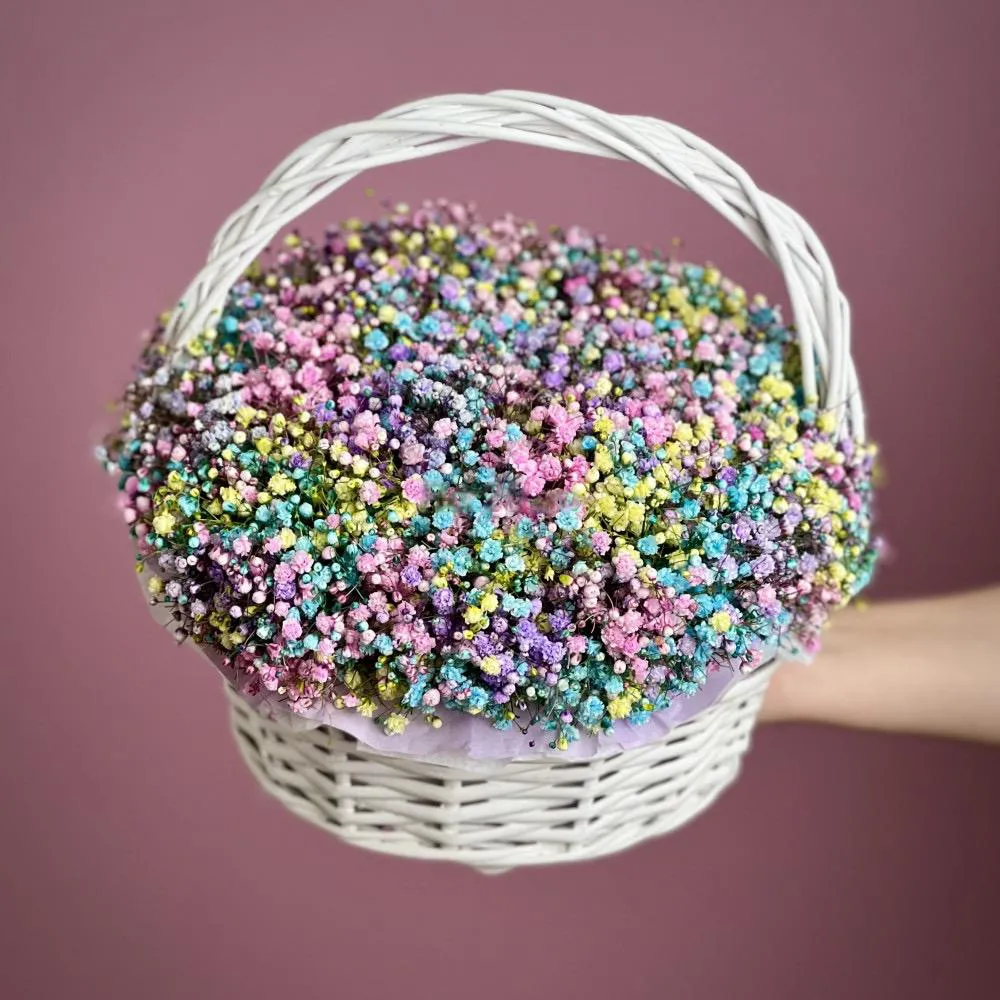 Погрузитесь в мир нежности и волшебства с нашей корзиной радужной гипсофилы. Этот воздушный букет, словно сотканный из мечтаний, станет прекрасным подарком для любимого человека или изысканным украшением вашего интерьера. Легкие облачка гипсофилы, окрашенные во все цвета радуги, дарят ощущение легкости и безмятежности. Позвольте этой корзине гипсофилы добавить ярких красок и позитива в вашу жизнь!